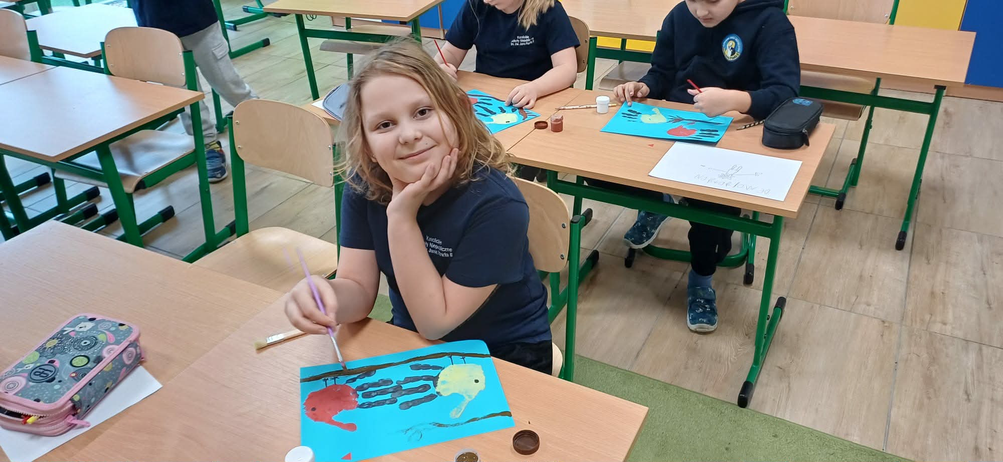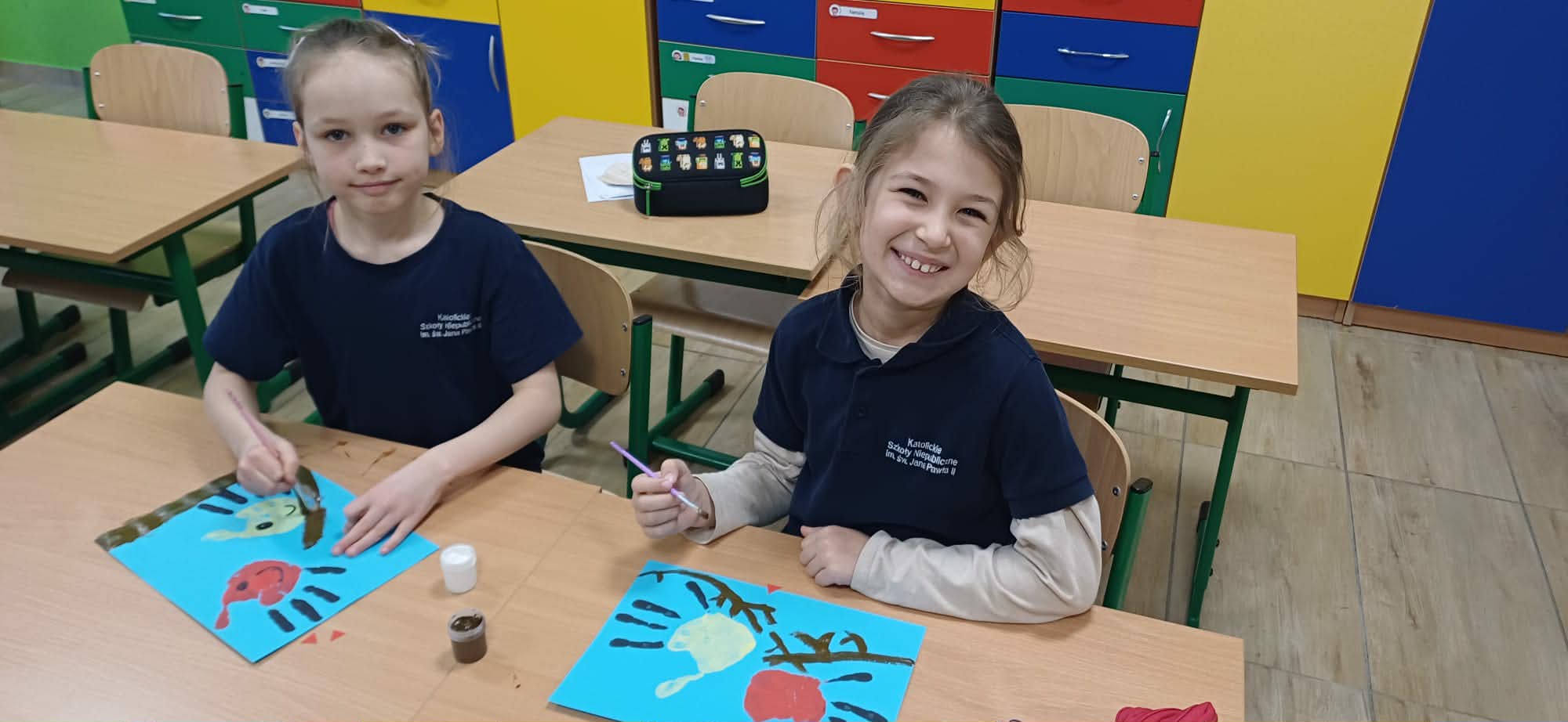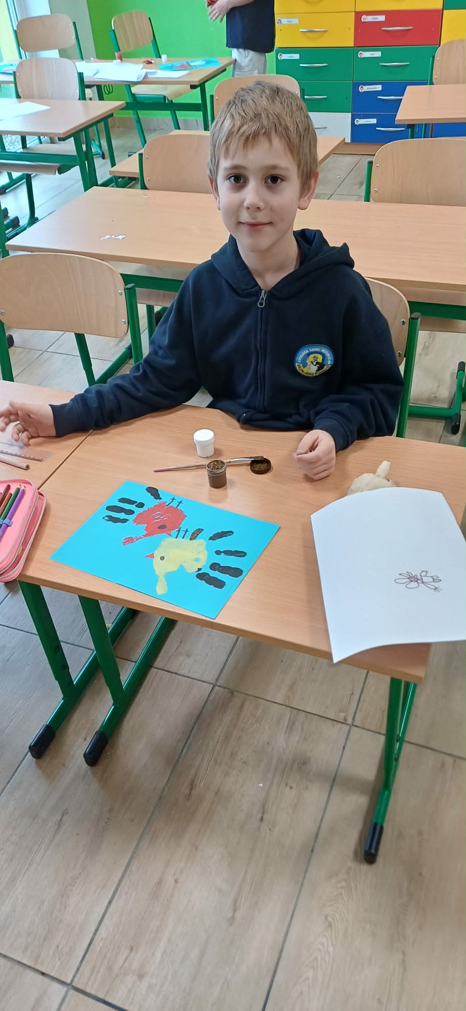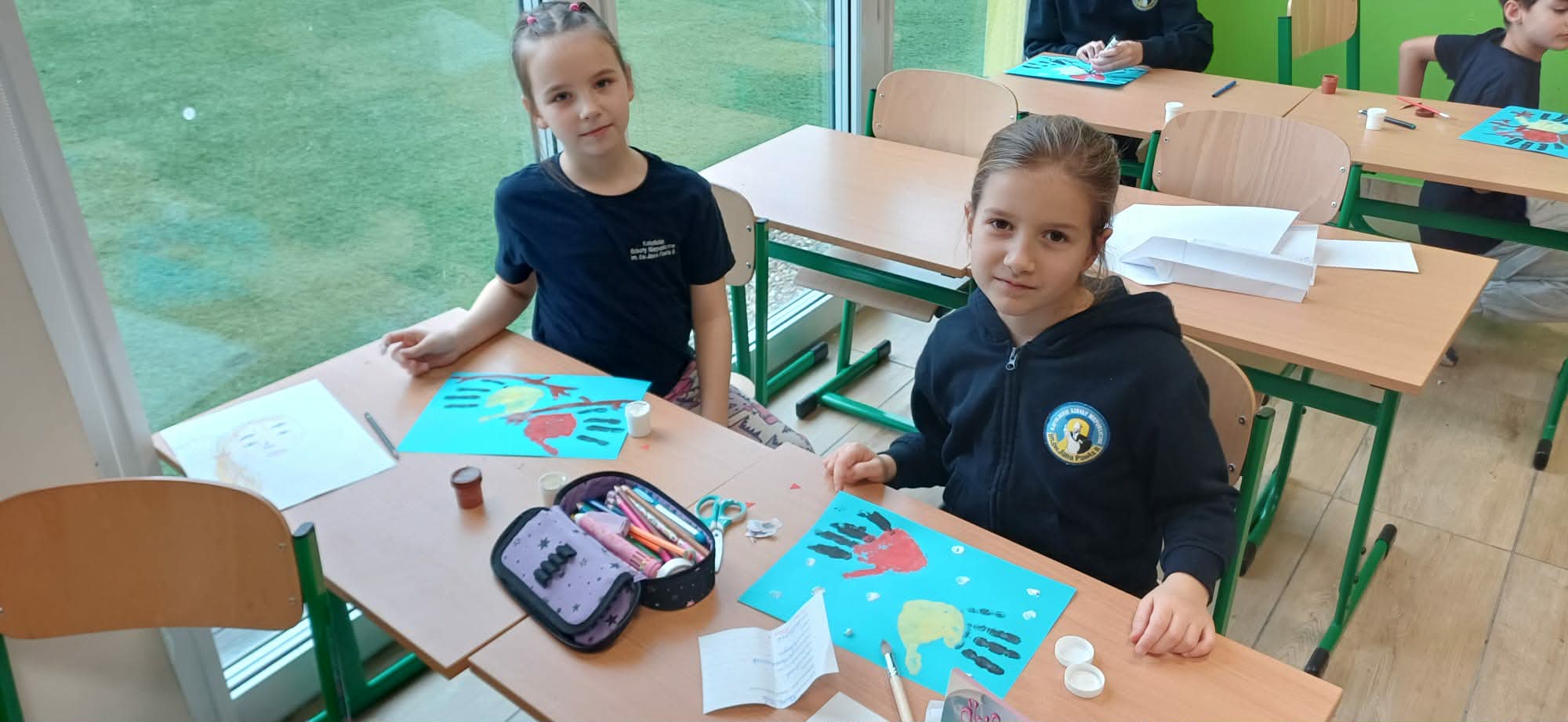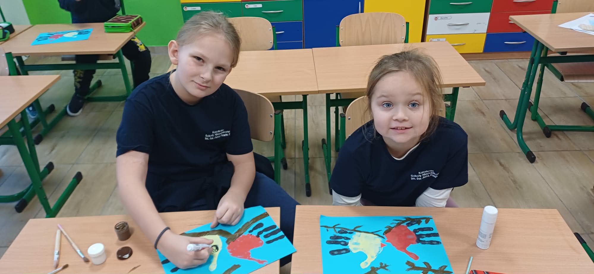 Zainspirowani zbliżającą się porą roku, drugoklasiści postanowili uwiecznić na papierze urok zimy i jej skrzydlatych mieszkańców. Rozpoczęli od pomalowania swoich dłoni kolorowymi farbami, a następnie odcisnęli je na kartkach. W ten sposób, w mgnieniu oka, powstały urocze sylwetki ptaków, gotowych na nadejście zimy.
