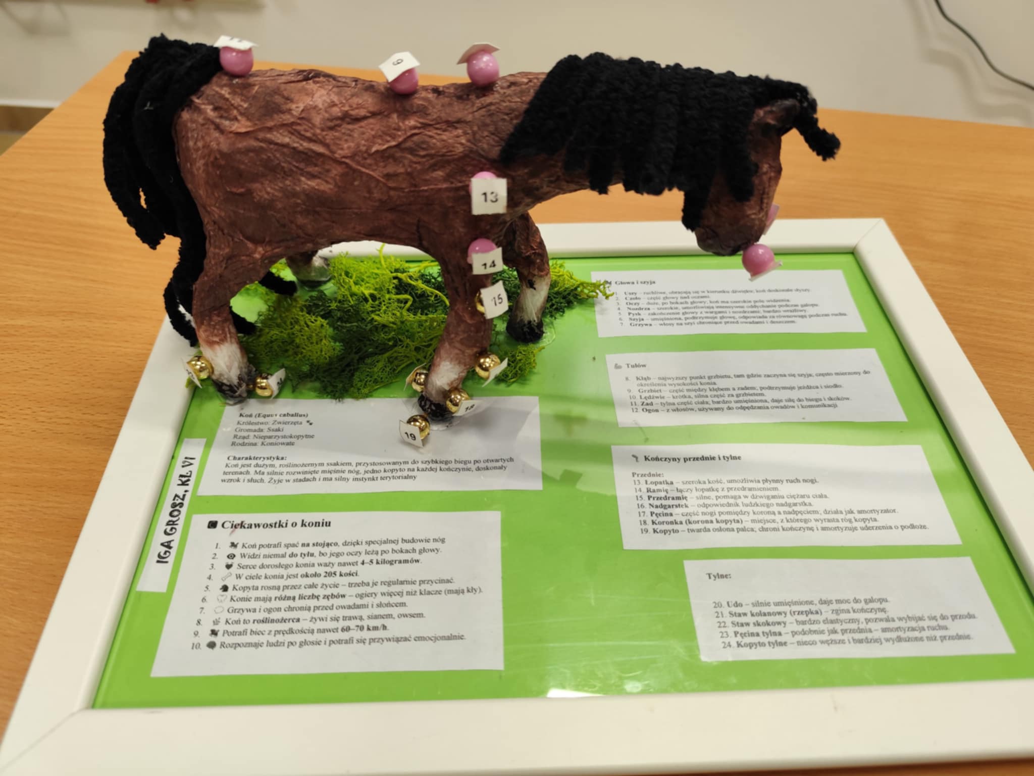 Prezentacje były prawdziwą ucztą dla oczu i uszu. Uczniowie nie tylko pokazywali swoje modele, ale również opowiadali o budowie zwierząt, ich charakterystycznych cechach oraz ciekawostkach z ich życia. Słuchaliśmy o tym, jak zbudowany jest szkielet psa, jak ślimak porusza się po liściach, jak pająk buduje swoją sieć, jak śledź pływa w oceanie i jak koń galopuje po łąkach. Dzieci dzieliły się fascynującymi informacjami, które zdobyły podczas przygotowań.